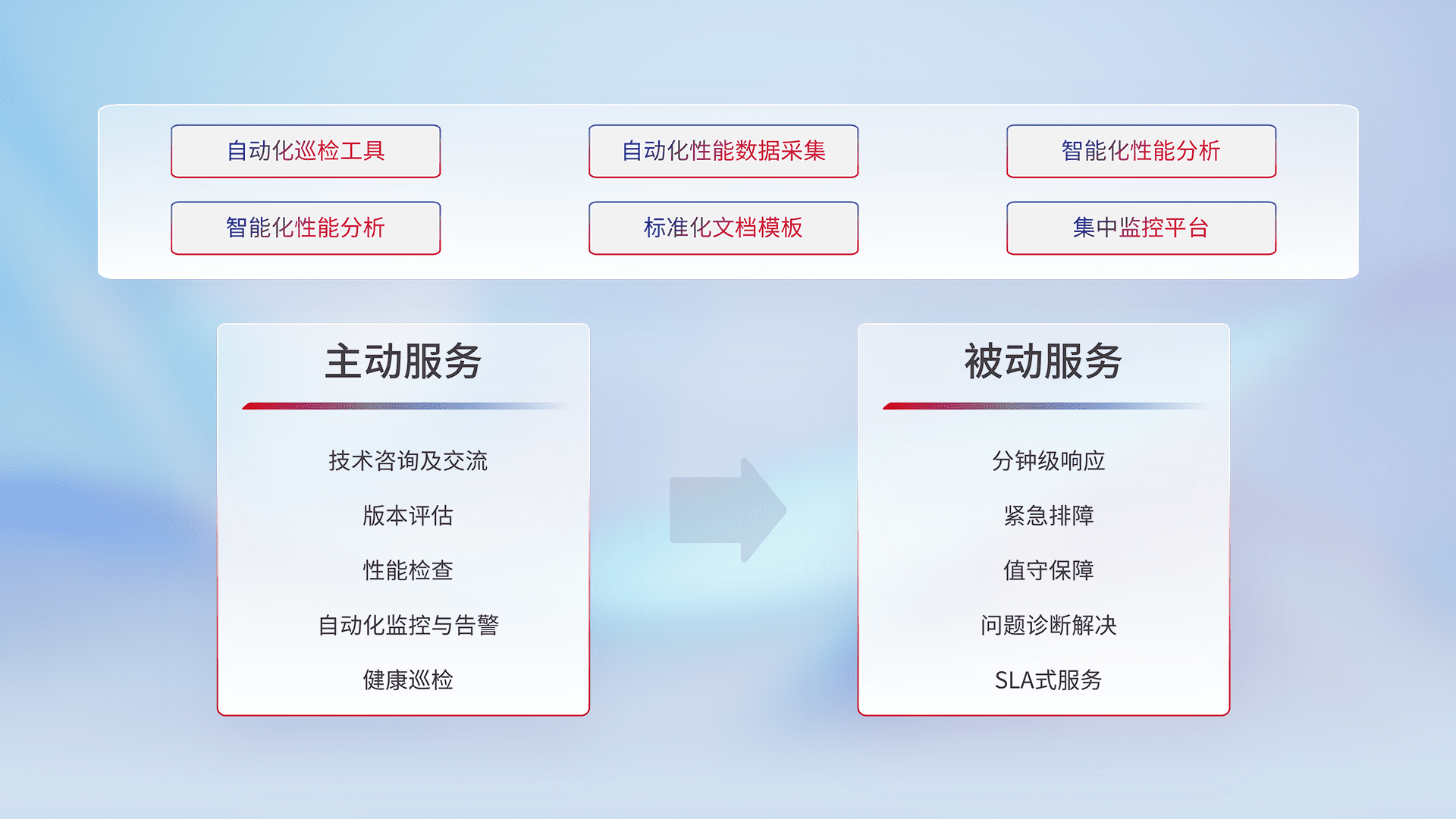 智能化工具和标准化文档,,,,保障服务质量,,,,提供主动服务(包含技术咨询、、、、版本评估、、、、性能检查、、自动化监控与告警、、、健康巡检)和被动服务包含(分钟级响应、、、紧急排障、、、、值守保障、、、问题诊断解决、、、SLA服务)。。